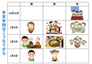 最後に年末年始はこのような食事パータンになりがちになってしまいます。