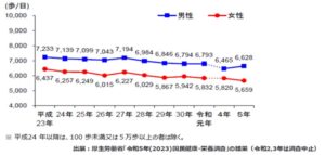 しかし実際は下のグラフにあるように令和5年のデータでは男性6628歩、女性5659歩であり、右肩下がりで少しずつ減少しています。